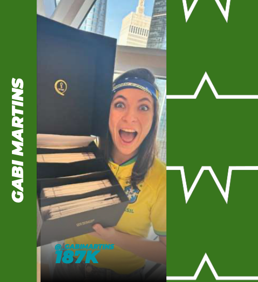Reconhecida como uma das vozes femininas mais autênticas no universo esportivo digital, Gabi Martins se destacou ao acompanhar todos os jogos da Copa do Mundo de 2022 no Catar, trazendo análises no videocast Joga nas 11 do R7. Hoje, soma 187 mil seguidores no Instagram (@_gabimartins), onde compartilha seu amor pelo futebol e sua rotina fitness inspiradora.